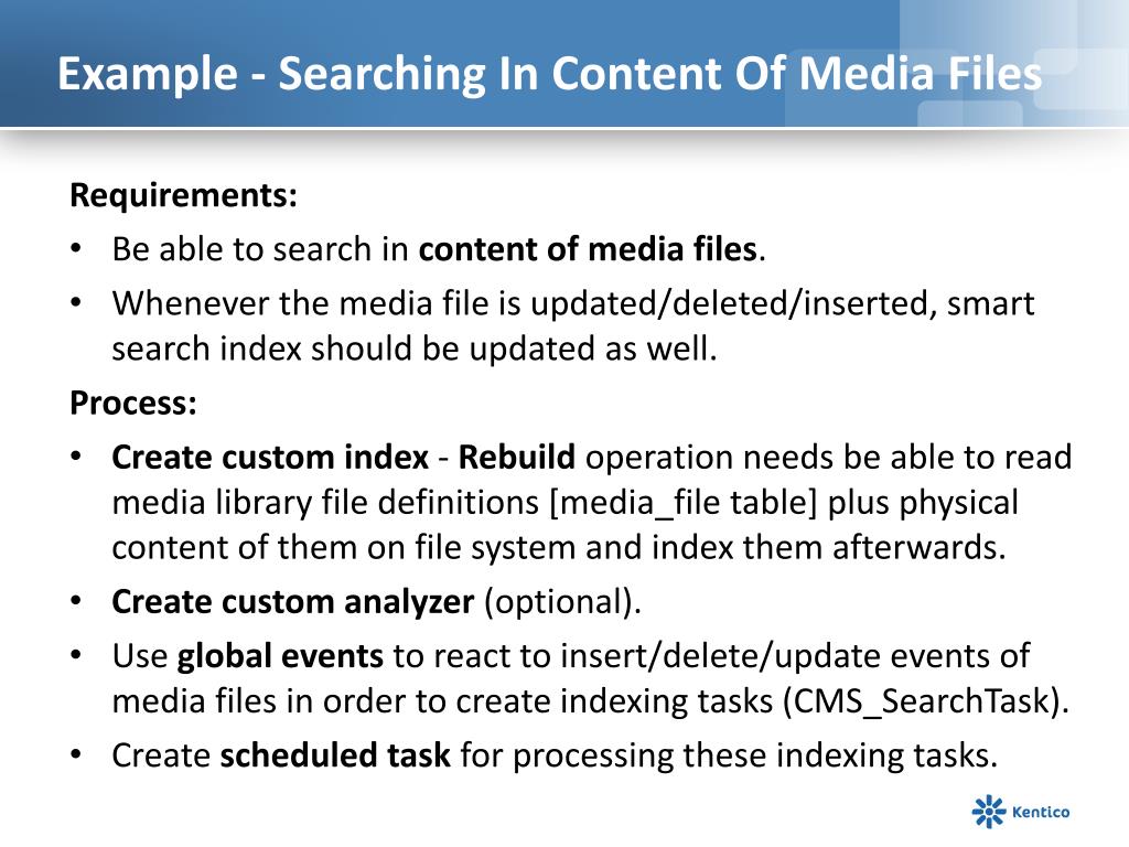 Example - Searching In Content Of Media Files Requirements: Be able to search in content of media files. Whenever the media file is updated/deleted/inserted, smart search index should be updated as well. Process: Create custom index - Rebuild operation needs be able to read media library file definitions [media_file table] plus physical content of them on file system and index them afterwards. Create custom analyzer (optional). Use global events to react to insert/delete/update events of media files in order to create indexing tasks (CMS_SearchTask). Create scheduled task for processing these indexing tasks.