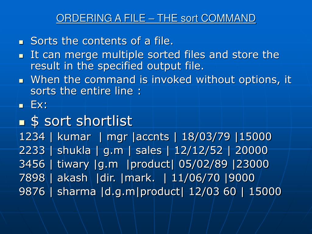 ORDERING A FILE – THE sort COMMAND • Sorts the contents of a file. • It can merge multiple sorted files and store the result in the specified output file. • When the command is invoked without options, it sorts the entire line : • Ex: • $ sort shortlist 1234 | kumar | mgr |accnts | 18/03/79 |15000 2233 | shukla | g.m | sales | 12/12/52 | 20000 3456 | tiwary |g.m |product| 05/02/89 |23000 7898 | akash |dir. |mark. | 11/06/70 |9000 9876 | sharma |d.g.m|product| 12/03 60 | 15000