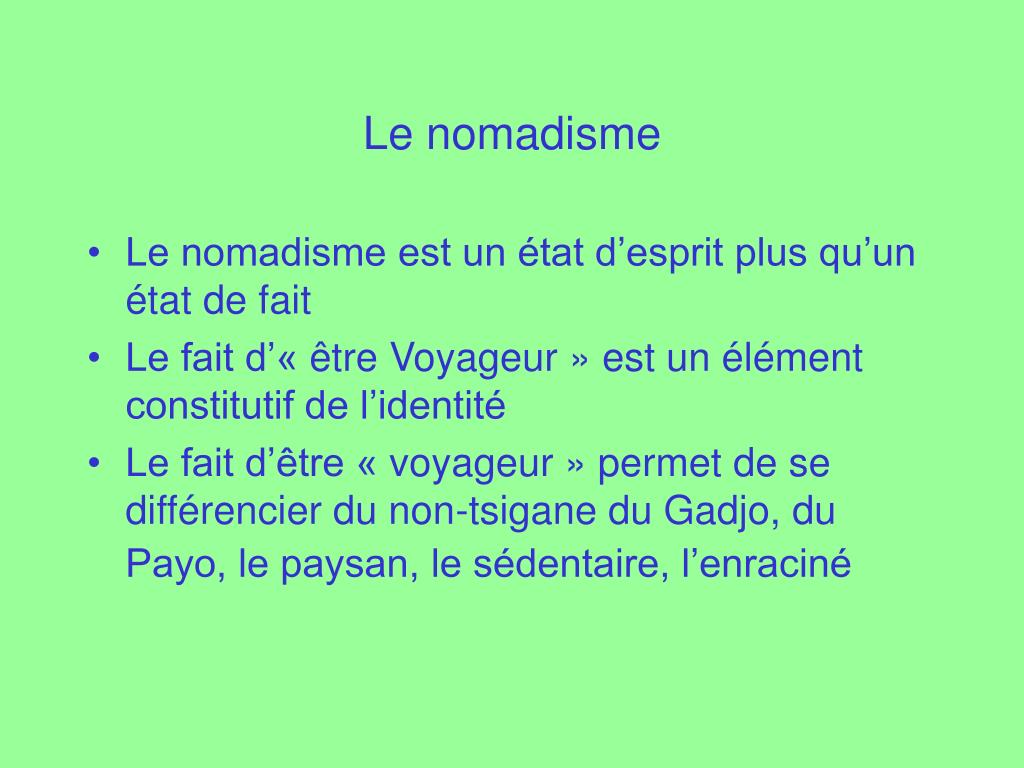 Le nomadisme • Le nomadisme est un état d’esprit plus qu’un état de fait • Le fait d’« être Voyageur » est un élément constitutif de l’identité • Le fait d’être « voyageur » permet de se différencier du non-tsigane du Gadjo, du Payo, le paysan, le sédentaire, l’enraciné