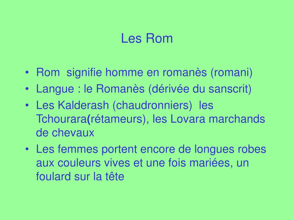 Les Rom • Rom signifie homme en romanès (romani) • Langue : le Romanès(dérivée du sanscrit) • Les Kalderash (chaudronniers) les Tchourara(rétameurs), les Lovara marchands de chevaux • Les femmes portent encore de longues robes aux couleurs vives et une fois mariées, un foulard sur la tête