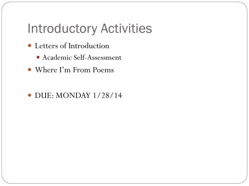 Introductory Activities • Letters of Introduction • Academic Self-Assessment • Where I’m From Poems • DUE: MONDAY 1/28/14