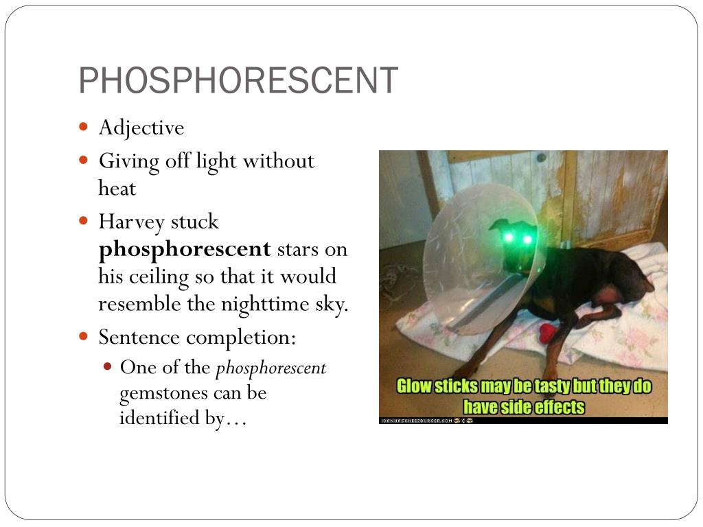 PHOSPHORESCENT • Adjective • Giving off light without heat • Harvey stuck phosphorescent stars on his ceiling so that it would resemble the nighttime sky. • Sentence completion: • One of the phosphorescent gemstones can be identified by…