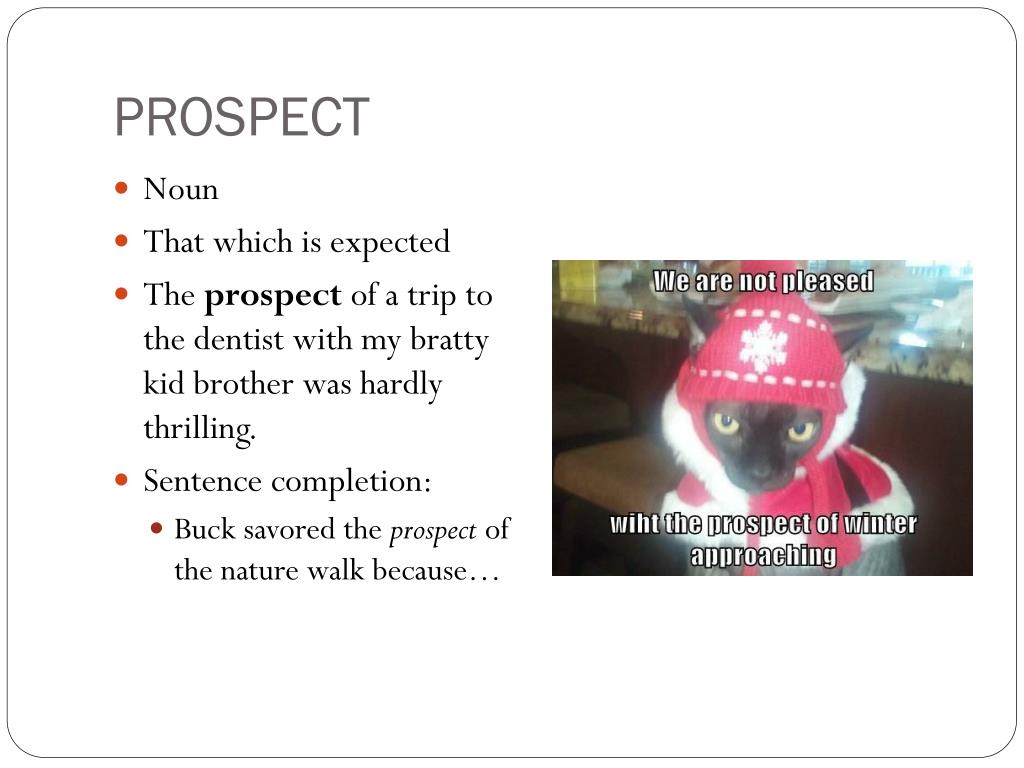 PROSPECT • Noun • That which is expected • The prospect of a trip to the dentist with my bratty kid brother was hardly thrilling. • Sentence completion: • Buck savored the prospect of the nature walk because…