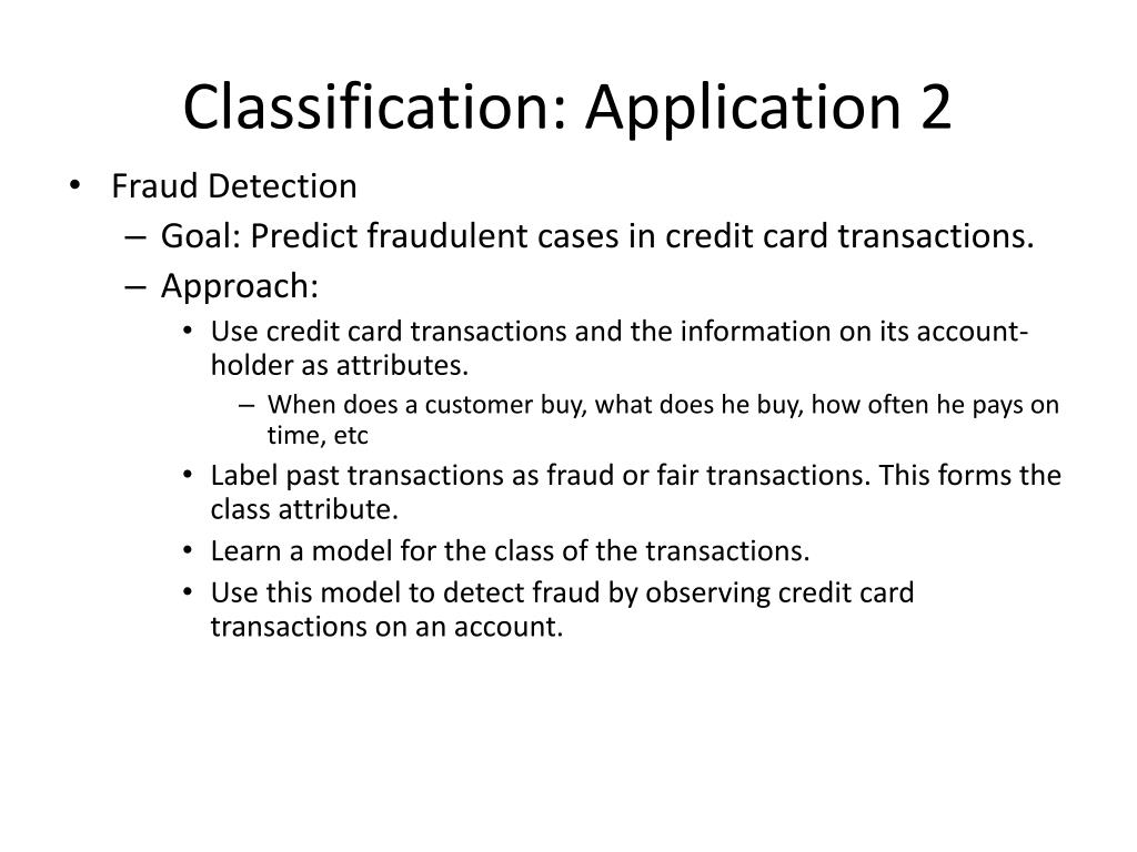 Classification: Application 2 • Fraud Detection • Goal: Predict fraudulent cases in credit card transactions. • Approach: • Use credit card transactions and the information on its account-holder as attributes. • When does a customer buy, what does he buy, how often he pays on time, etc • Label past transactions as fraud or fair transactions. This forms the class attribute. • Learn a model for the class of the transactions. • Use this model to detect fraud by observing credit card transactions on an account.
