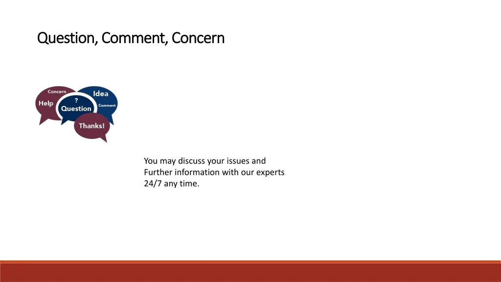 Question, Comment, Concern You may discuss your issues and Further information with our experts 24/7 any time.