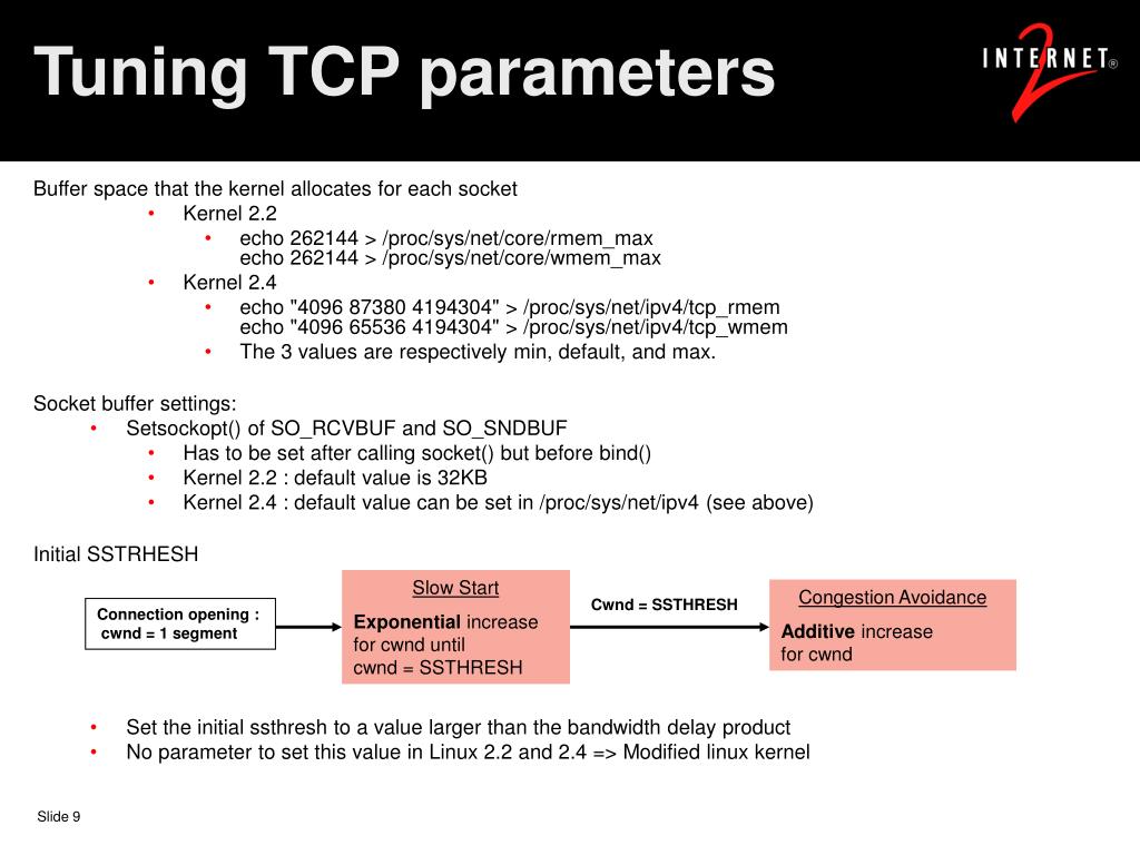 Tuning TCP parameters Buffer space that the kernel allocates for each socket • Kernel 2.2 • echo 262144 > /proc/sys/net/core/rmem_max echo 262144 > /proc/sys/net/core/wmem_max • Kernel 2.4 • echo "4096 87380 4194304" > /proc/sys/net/ipv4/tcp_rmemecho "4096 65536 4194304" > /proc/sys/net/ipv4/tcp_wmem • The 3 values are respectively min, default, and max. Socket buffer settings: • Setsockopt() of SO_RCVBUF and SO_SNDBUF • Has to be set after calling socket() but before bind() • Kernel 2.2 : default value is 32KB • Kernel 2.4 : default value can be set in /proc/sys/net/ipv4 (see above) Initial SSTRHESH • Set the initial ssthresh to a value larger than the bandwidth delay product • No parameter to set this value in Linux 2.2 and 2.4 => Modified linux kernel Slow Start Exponential increase for cwnd until cwnd = SSTHRESH Congestion Avoidance Additive increase for cwnd Cwnd = SSTHRESH Connection opening : cwnd = 1 segment