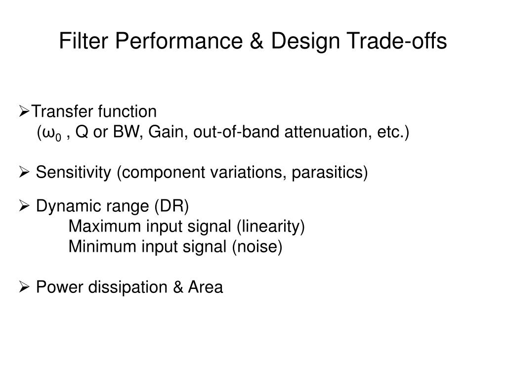Filter Performance & Design Trade-offs • Transfer function • (ω0 , Q or BW, Gain, out-of-band attenuation, etc.) • Sensitivity (component variations, parasitics) • Dynamic range (DR) • Maximum input signal (linearity) • Minimum input signal (noise) • Power dissipation & Area