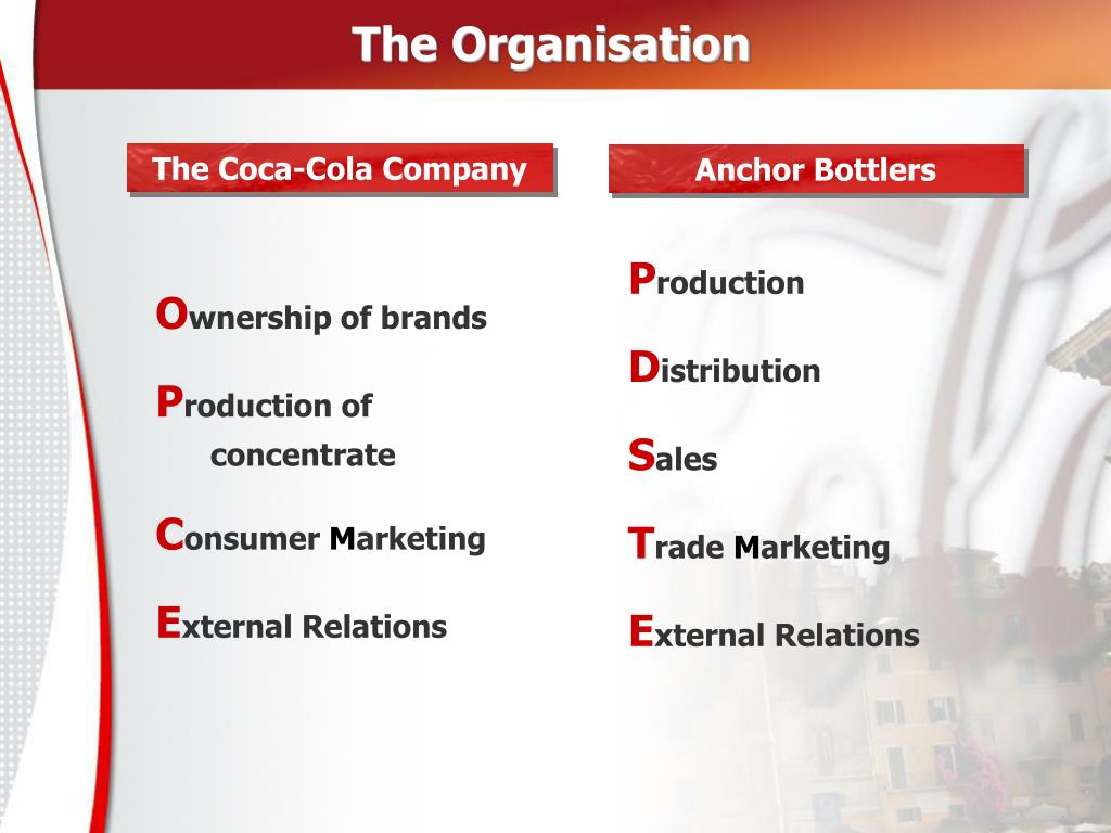 The Organisation The Coca-Cola Company Anchor Bottlers Production Distribution Sales Trade Marketing External Relations Ownership of brands Production of concentrate Consumer Marketing External Relations