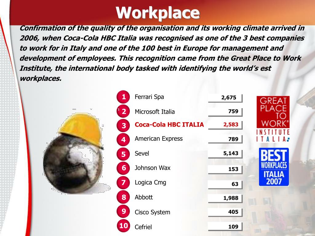 Confirmation of the quality of the organisation and its working climate arrived in 2006, when Coca-Cola HBC Italia was recognised as one of the 3 best companies to work for in Italy and one of the 100 best in Europe for management and development of employees. This recognition came from the Great Place to Work Institute, the international body tasked with identifying the world’s est workplaces. 1 Ferrari Spa 2,675 2 Microsoft Italia 759 Coca-Cola HBC ITALIA 2,583 3 American Express 4 789 Sevel 5 5,143 6 Johnson Wax 153 7 Logica Cmg 63 8 Abbott 1,988 9 Cisco System 405 10 Cefriel 109 Workplace