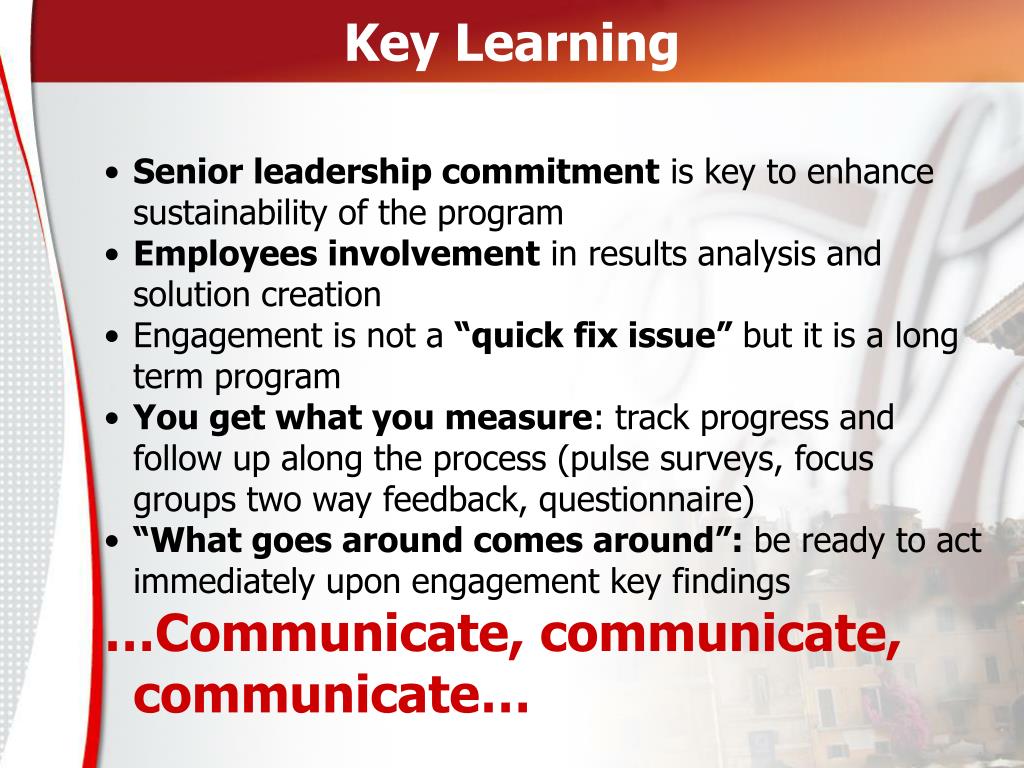 Key Learning • Senior leadership commitment is key to enhance sustainability of the program • Employees involvement in results analysis and solution creation • Engagement is not a “quick fix issue” but it is a long term program • You get what you measure: track progress and follow up along the process (pulse surveys, focus groups two way feedback, questionnaire) • “What goes around comes around”: be ready to act immediately upon engagement key findings • …Communicate, communicate, communicate…