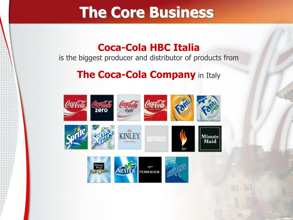 The Core Business Coca-Cola HBC Italia is the biggest producer and distributor of products from The Coca-Cola Company in Italy