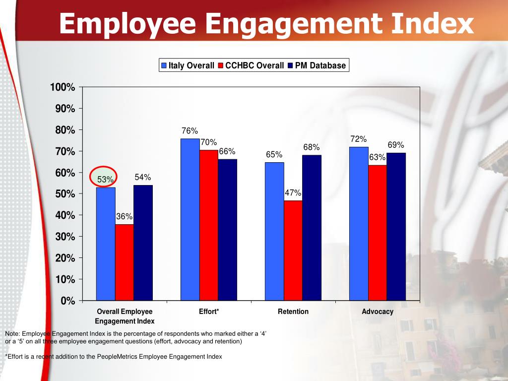 Employee Engagement Index Note: Employee Engagement Index is the percentage of respondents who marked either a ‘4’ or a ‘5’ on all three employee engagement questions (effort, advocacy and retention) *Effort is a recent addition to the PeopleMetrics Employee Engagement Index