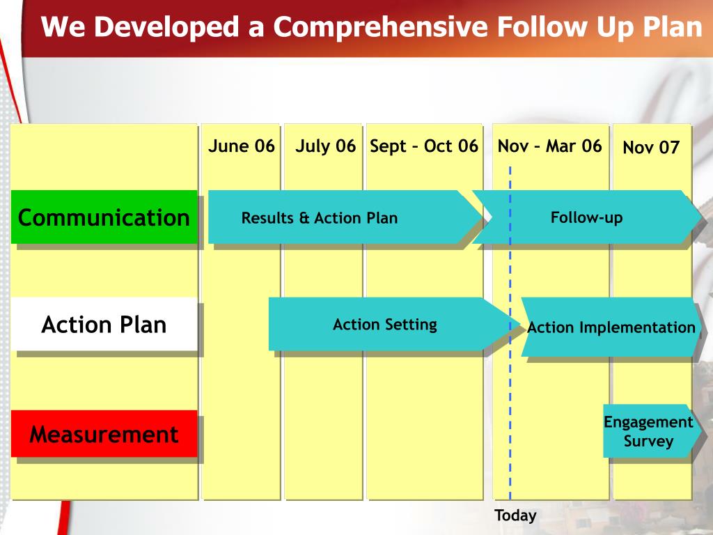 Results & Action Plan We Developed a Comprehensive Follow Up Plan June 06 July 06 Sept – Oct 06 Nov – Mar 06 Nov 07 Communication Follow-up Action Plan Action Setting Action Implementation Engagement Survey Measurement Today