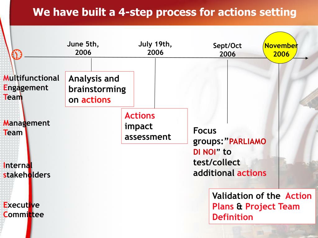 We have built a 4-step process for actions setting June 5th, 2006 July 19th, 2006 Sept/Oct 2006 November 2006 ‘ Multifunctional Engagement Team Analysis and brainstorming on actions Actions impact assessment Management Team Focus groups:”PARLIAMO DI NOI” to test/collect additional actions Internal stakeholders Validation of the ActionPlans &Project Team Definition Executive Committee