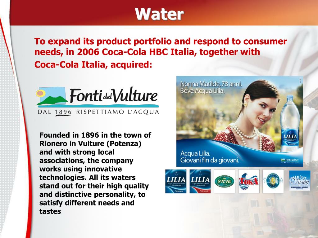 Water To expand its product portfolio and respond to consumer needs, in 2006 Coca-Cola HBC Italia, together with Coca-Cola Italia, acquired: Founded in 1896 in the town of Rionero in Vulture (Potenza) and with strong local associations, the company works using innovative technologies. All its waters stand out for their high quality and distinctive personality, to satisfy different needs and tastes