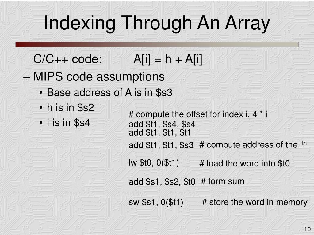 Indexing Through An Array C/C++ code: A[i] = h + A[i] • MIPS code assumptions • Base address of A is in $s3 • h is in $s2 • i is in $s4 # compute the offset for index i, 4 * i add $t1, $s4, $s4 add $t1, $t1, $t1 # compute address of the ith add $t1, $t1, $s3 lw $t0, 0($t1) # load the word into $t0 # form sum add $s1, $s2, $t0 sw $s1, 0($t1) # store the word in memory