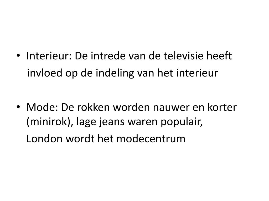 Interieur: De intrede van de televisie heeft invloed op de indeling van het interieur • Mode: De rokken worden nauwer en korter (minirok), lage jeans waren populair, London wordt het modecentrum
