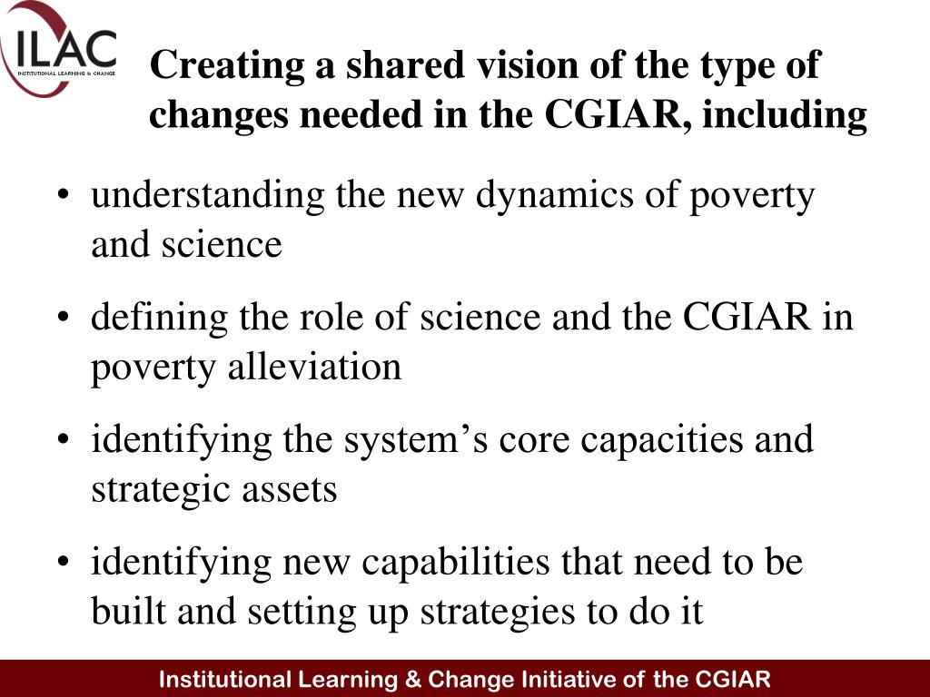 Creating a shared vision of the type of changes needed in the CGIAR, including • understanding the new dynamics of poverty and science • defining the role of science and the CGIAR in poverty alleviation • identifying the system’s core capacities and strategic assets • identifying new capabilities that need to be built and setting up strategies to do it