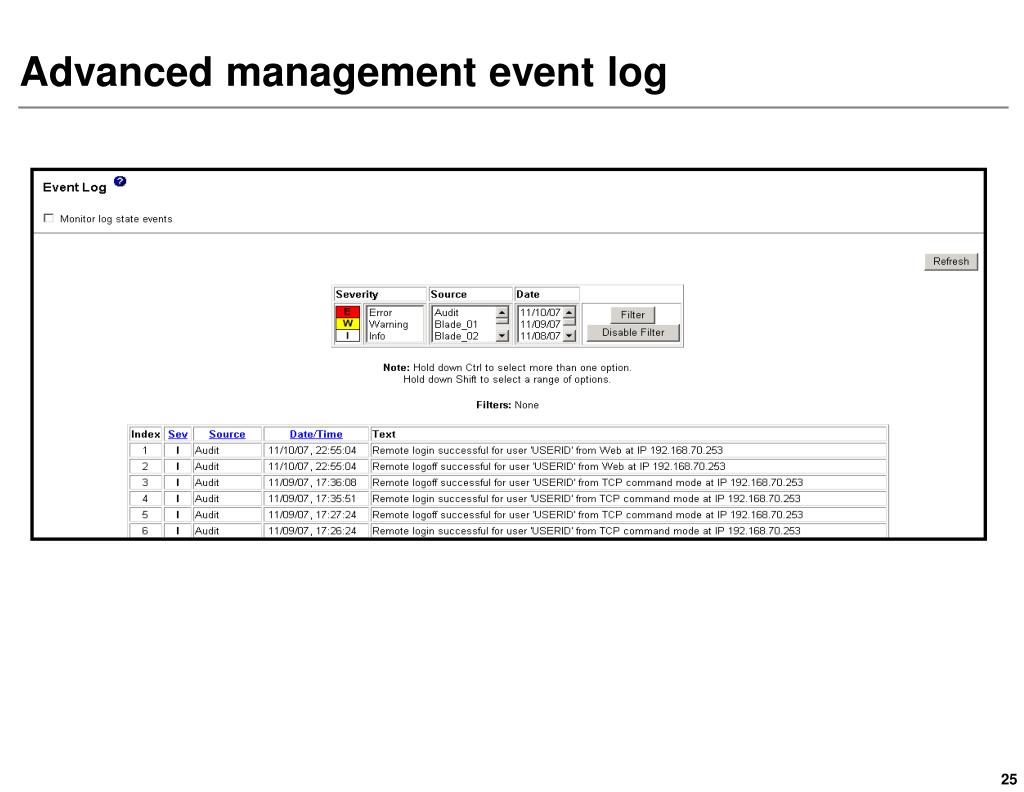 System Event Log (SEL) screen • This screen shows event history of the BladeCenter