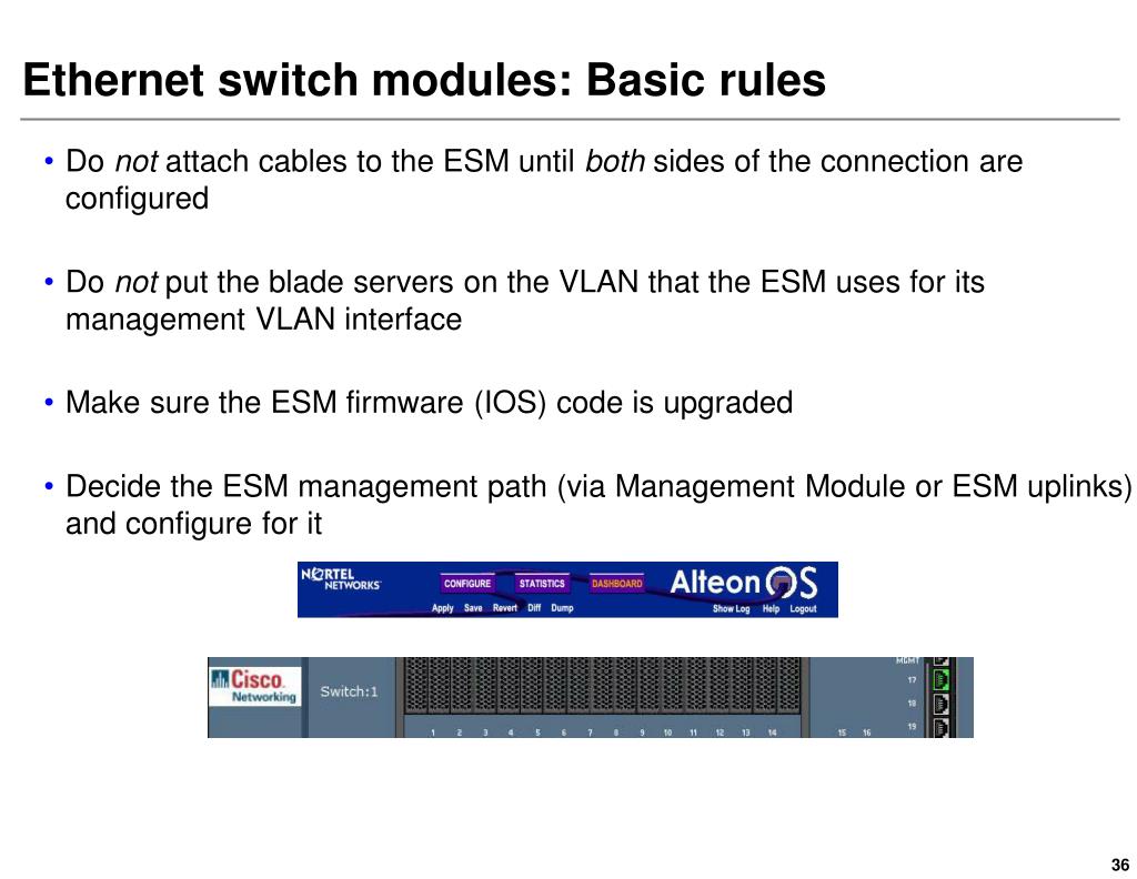 Do not attach cables to the ESM until both sides of the connection are configured Do not put the blade servers on the VLAN that the ESM uses for its management VLAN interface Make sure the ESM firmware (IOS) code is upgraded Decide the ESM management path (via Management Module or ESM uplinks) and configure for it Ethernet switch modules: Basic rules