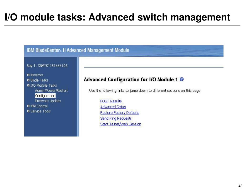 Rules for I/O module management • In-band management • Use the AMM path to an I/O module • Provides centralized management of all I/O modules • All activities and reporting is through a single Ethernet port • Makes LAN configuration easier • Requires MM and all I/O modules to be on the same IP subnet • Out-of-band management • Requires enablement of external management over all ports • May require management VLAN configuration • Access will involve many Ethernet ports • I/O module need not be on the same IP subnet as the MM • If subnets are different, AMM path to I/O module is unavailable
