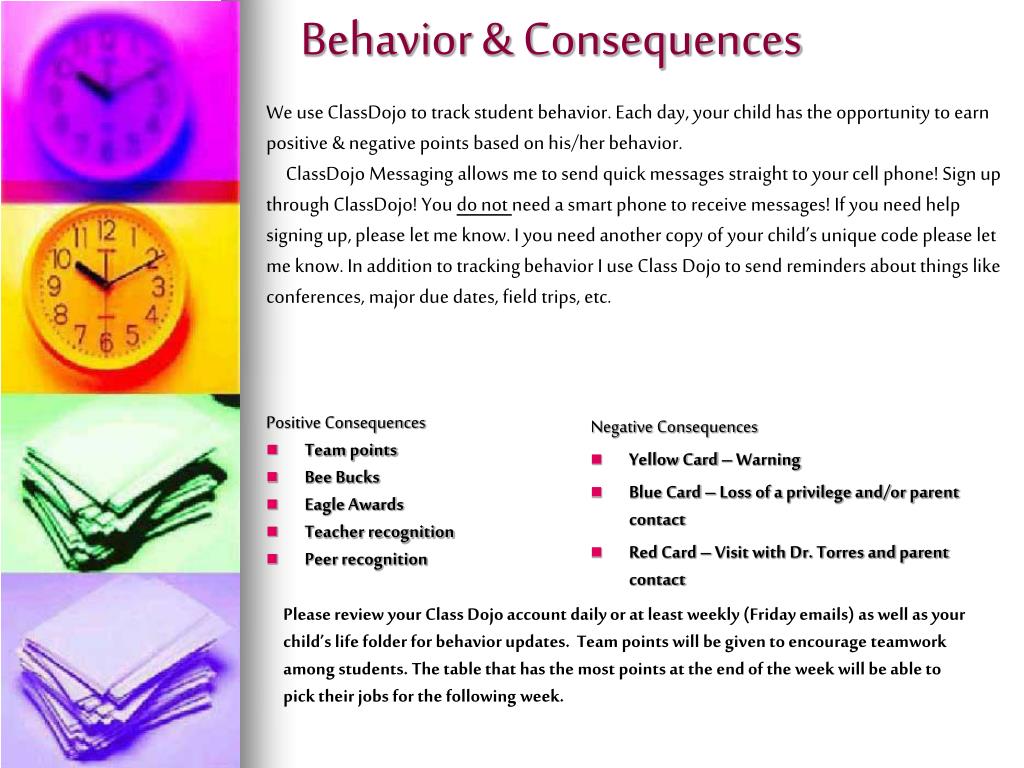 Positive Consequences Team points Bee Bucks Eagle Awards Teacher recognition Peer recognition Negative Consequences Yellow Card – Warning Blue Card – Loss of a privilege and/or parent contact Red Card – Visit with Dr. Torres and parent contact Behavior & Consequences We use ClassDojo to track student behavior. Each day, your child has the opportunity to earn positive & negative points based on his/her behavior. ClassDojo Messaging allows me to send quick messages straight to your cell phone! Sign up through ClassDojo! You do not need a smart phone to receive messages! If you need help signing up, please let me know. I you need another copy of your child’s unique code please let me know. In addition to tracking behavior I use Class Dojo to send reminders about things like conferences, major due dates, field trips, etc. Please review your Class Dojo account daily or at least weekly (Friday emails) as well as your child’s life folder for behavior updates. Team points will be given to encourage teamwork among students. The table that has the most points at the end of the week will be able to pick their jobs for the following week.