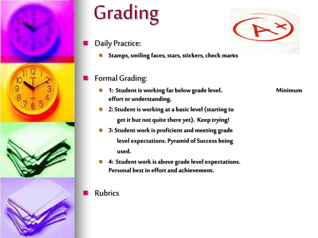 Grading • Daily Practice: • Stamps, smiling faces, stars, stickers, check marks • Formal Grading: • 1: Student is working far below grade level. Minimum effort or understanding. • 2: Student is working at a basic level (starting to get it but not quite there yet). Keep trying! • 3: Student work is proficient and meeting grade level expectations. Pyramid of Success being used. • 4: Student work is above grade level expectations. Personal best in effort and achievement. • Rubrics