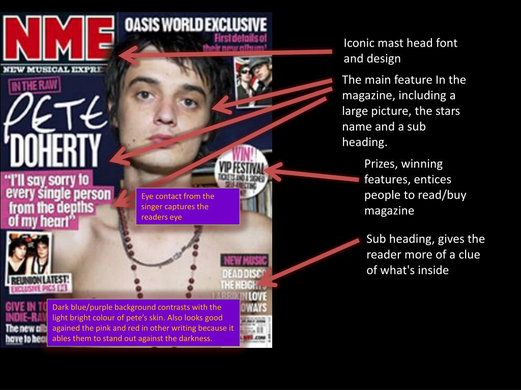 Iconic mast head font and design The main feature In the magazine, including a large picture, the stars name and a sub heading. Prizes, winning features, entices people to read/buy magazine Eye contact from the singer captures the readers eye Sub heading, gives the reader more of a clue of what's inside Dark blue/purple background contrasts with the light bright colour of pete’s skin. Also looks good agained the pink and red in other writing because it ables them to stand out against the darkness.