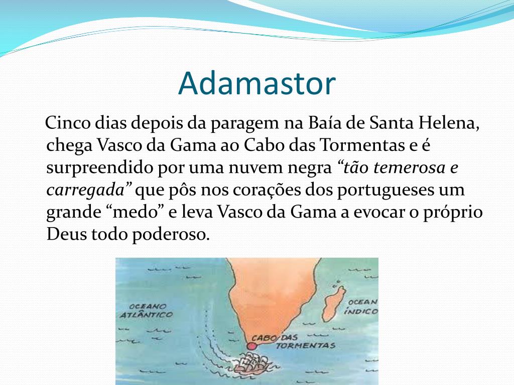Adamastor Cinco dias depois da paragem na Baía de Santa Helena, chega Vasco da Gama ao Cabo das Tormentas e é surpreendido por uma nuvem negra “tão temerosa e carregada” que pôs nos corações dos portugueses um grande “medo” e leva Vasco da Gama a evocar o próprio Deus todo poderoso.