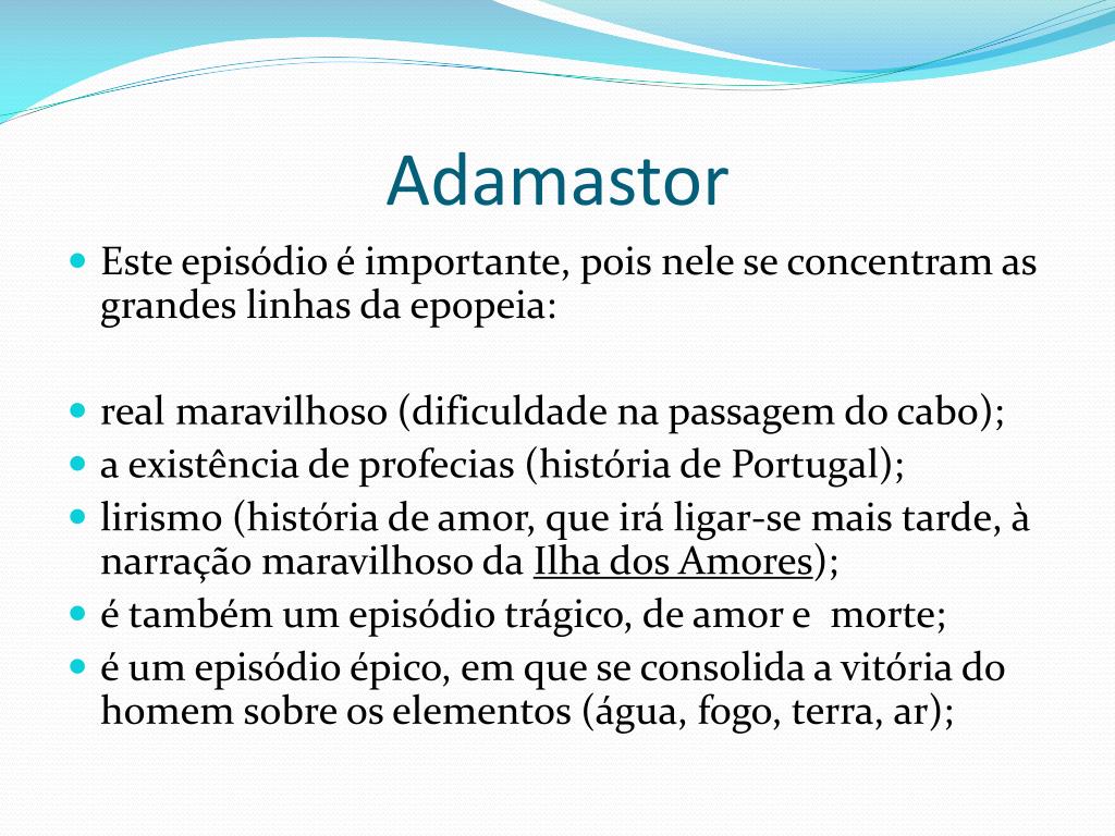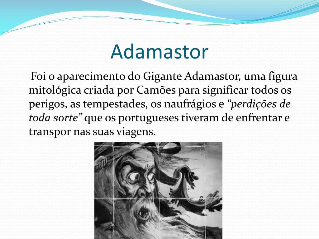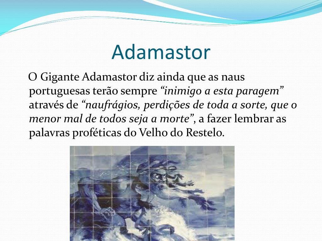Adamastor O Gigante Adamastor diz ainda que as naus portuguesas terão sempre “inimigo a esta paragem” através de “naufrágios, perdições de toda a sorte, que o menor mal de todos seja a morte”, a fazer lembrar as palavras proféticas do Velho do Restelo.