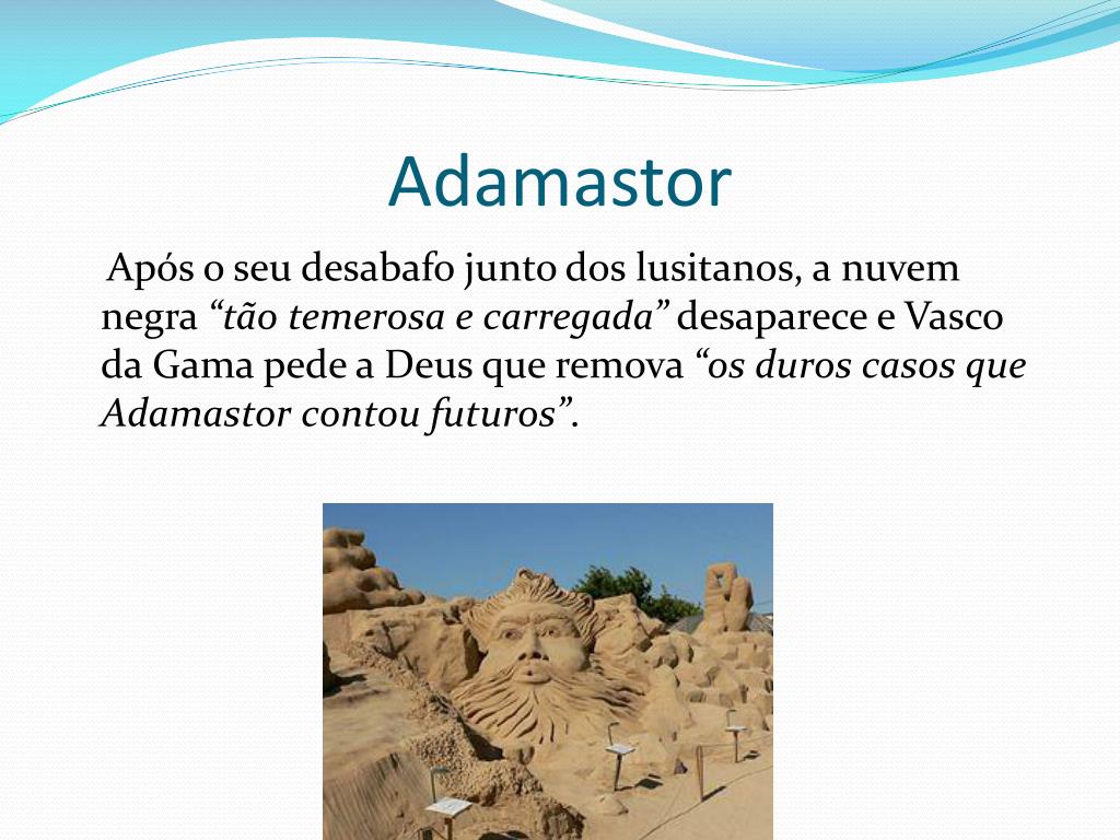 Adamastor Após o seu desabafo junto dos lusitanos, a nuvem negra “tão temerosa e carregada” desaparece e Vasco da Gama pede a Deus que remova “os duros casos que Adamastor contou futuros”.