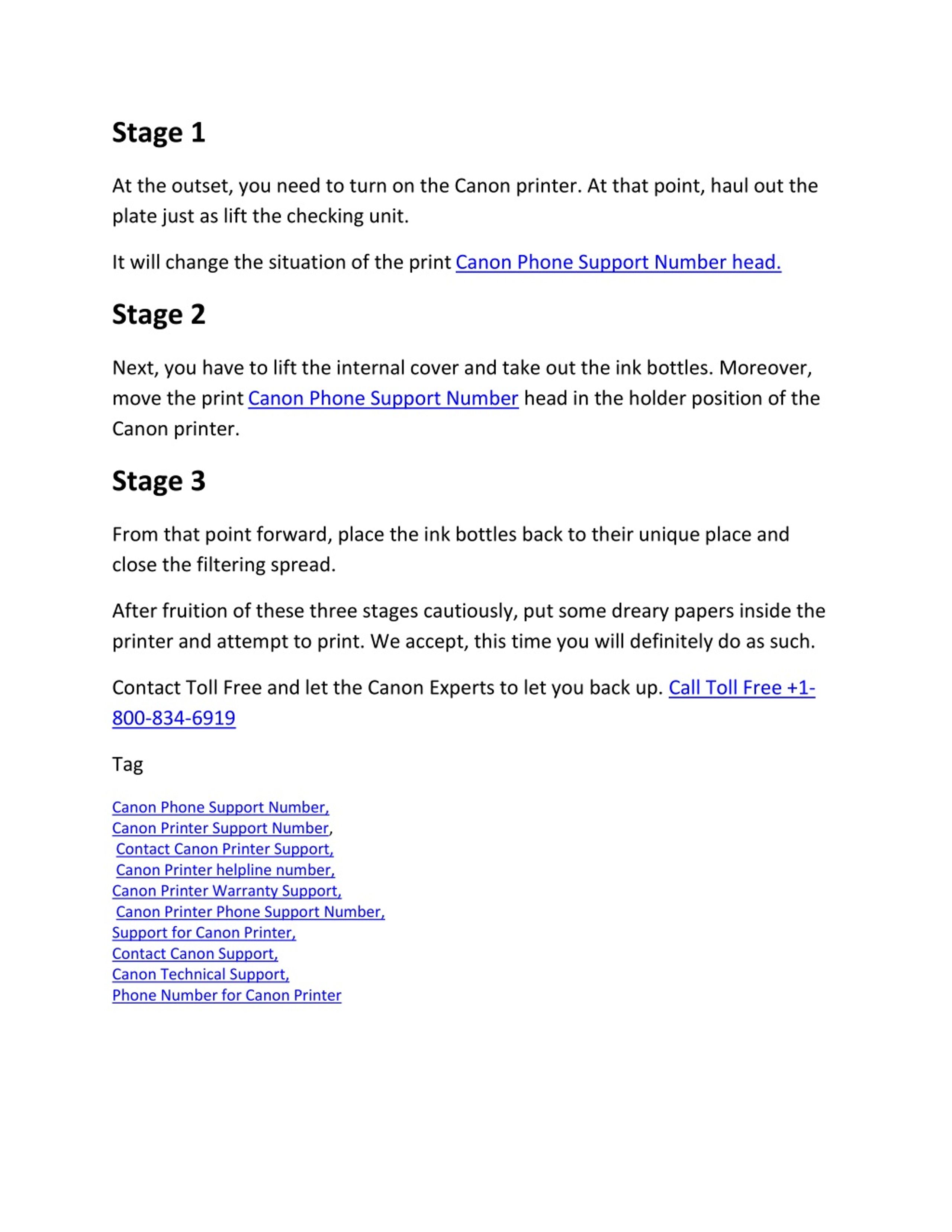 Stage 1 At the outset, you need to turn on the Canon printer. At that point, haul out the plate just as lift the checking unit. It will change the situation of the printCanon Phone Support Number head. Stage 2 Next, you have to lift the internal cover and take out the ink bottles. Moreover, move the printCanon Phone Support Number head in the holder position of the Canon printer. Stage 3 From that point forward, place the ink bottles back to their unique place and close the filtering spread. After fruition of these three stages cautiously, put some dreary papers inside the printer and attempt to print. We accept, this time you will definitely do as such. Contact Toll Free and let the Canon Experts to let you back up. Call Toll Free +1- 800-834-6919 Tag Canon Phone Support Number, Canon Printer Support Number, Contact Canon Printer Support, Canon Printer helpline number, Canon Printer Warranty Support, Canon Printer Phone Support Number, Support for Canon Printer, Contact Canon Support, Canon Technical Support, Phone Number for Canon Printer