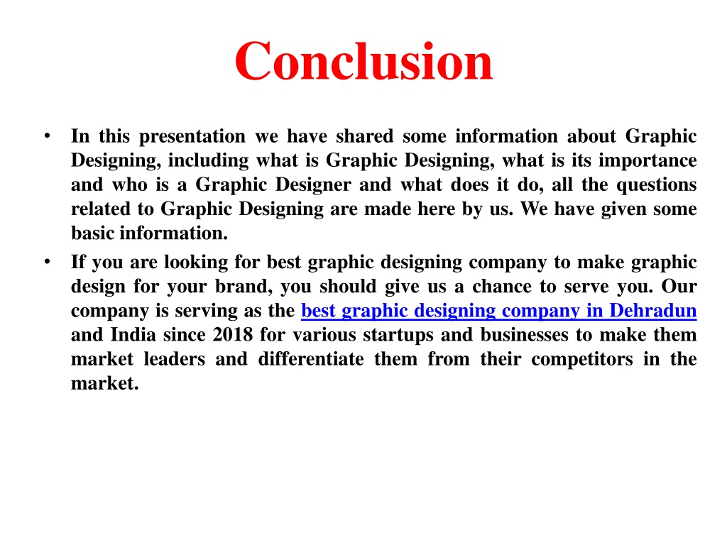 Conclusion • In this presentation we have shared some information about Graphic Designing, including what is Graphic Designing, what is its importance and who is a Graphic Designer and what does it do, all the questions related to Graphic Designing are made here by us. We have given some basic information. • If you are looking for best graphic designing company to make graphic design for your brand, you should give us a chance to serve you. Our company is serving as the best graphic designing company in Dehradunand India since 2018 for various startups and businesses to make them market leaders and differentiate them from their competitors in the market.