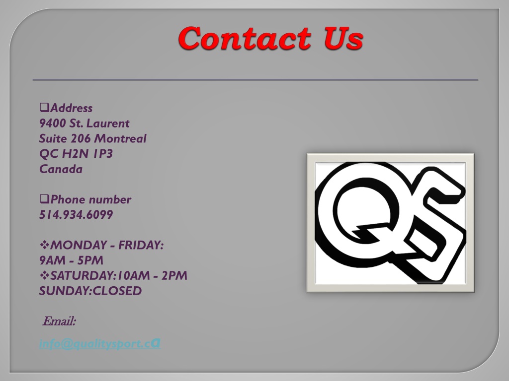Contact Us • Address • 9400 St. Laurent • Suite 206 Montreal • QC H2N 1P3 • Canada • Phone number • 514.934.6099 • MONDAY - FRIDAY: • 9AM - 5PM • SATURDAY:10AM - 2PM • SUNDAY:CLOSED Email: • info@qualitysport.ca