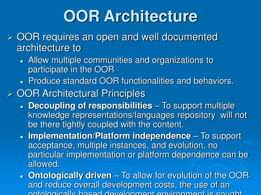 OOR Requirements • The repository architecture shall be scalable. • The repository shall be distributed. • The specification of the repository shall be sufficiently detailed and platform independent to allow multiple implementations. • The repository shall be capable of supporting ontologies in languages that have reasoners [supporting inferencing]. • The repository architecture shall support distributed repositories. • The repository architecture shall not require a hierarchical structure. http://ontolog.cim3.net/cgi-bin/wiki.pl?OpenOntologyRepository_Requirement 2
