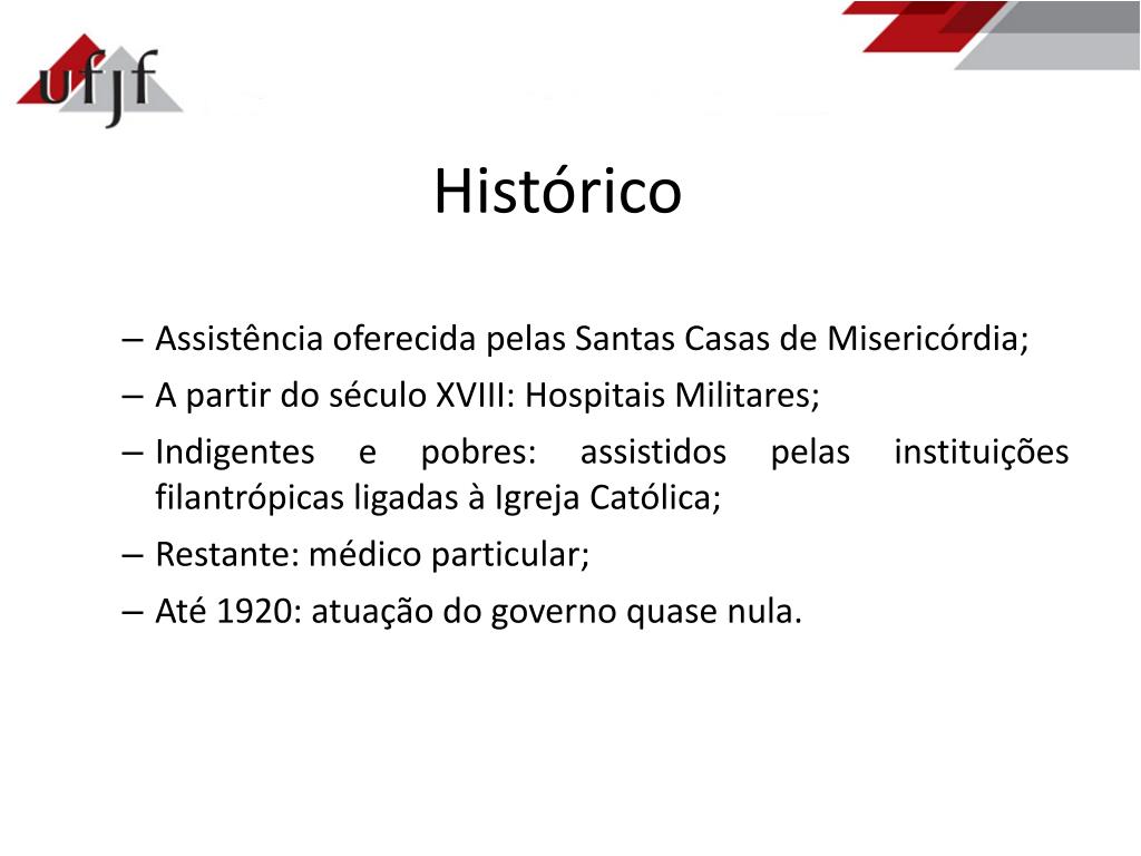Histórico • Assistência oferecida pelas Santas Casas de Misericórdia; • A partir do século XVIII: Hospitais Militares; • Indigentes e pobres: assistidos pelas instituições filantrópicas ligadas à Igreja Católica; • Restante: médico particular; • Até 1920: atuação do governo quase nula.