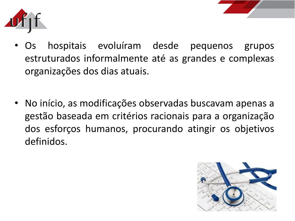 Os hospitais evoluíram desde pequenos grupos estruturados informalmente até as grandes e complexas organizações dos dias atuais. • No início, as modificações observadas buscavam apenas a gestão baseada em critérios racionais para a organização dos esforços humanos, procurando atingir os objetivos definidos.