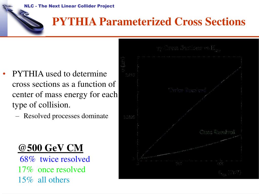 PYTHIA Parameterized Cross Sections • PYTHIA used to determine cross sections as a function of center of mass energy for each type of collision. • Resolved processes dominate @500 GeV CM 68% twice resolved 17% once resolved 15% all others