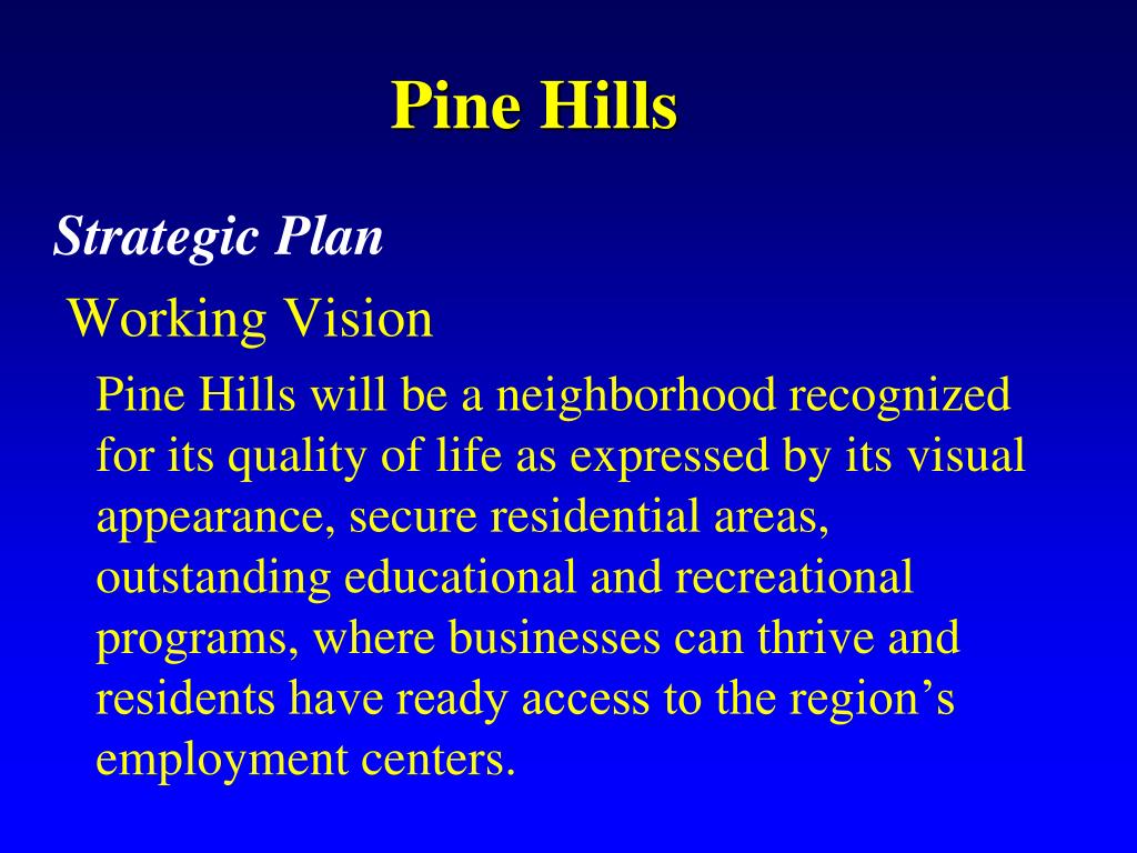 Pine Hills Strategic Plan Working Vision Pine Hills will be a neighborhood recognized for its quality of life as expressed by its visual appearance, secure residential areas, outstanding educational and recreational programs, where businesses can thrive and residents have ready access to the region’s employment centers.