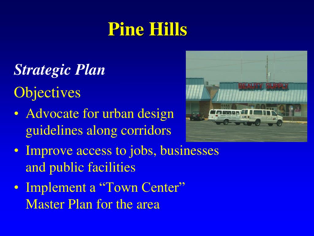 Pine Hills Strategic Plan Objectives • Advocate for urban design guidelines along corridors • Improve access to jobs, businesses and public facilities • Implement a “Town Center” Master Plan for the area