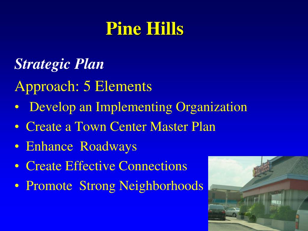 Pine Hills Strategic Plan Approach: 5 Elements • Develop an Implementing Organization • Create a Town Center Master Plan • Enhance Roadways • Create Effective Connections • Promote Strong Neighborhoods