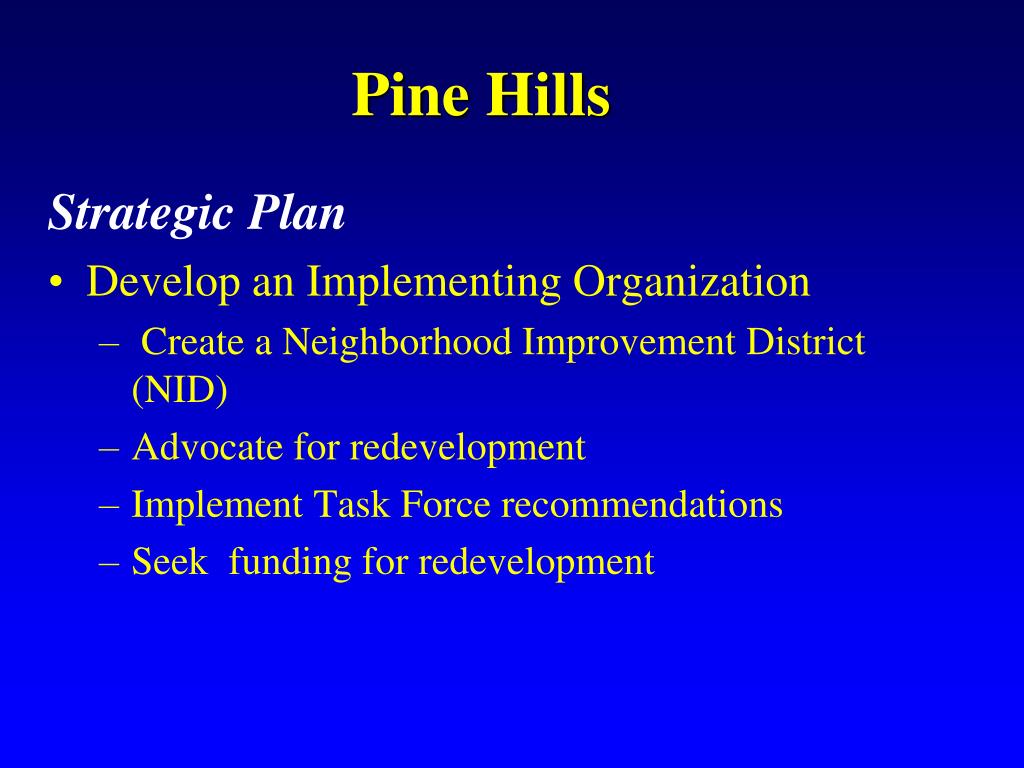 Pine Hills Strategic Plan • Develop an Implementing Organization • Create a Neighborhood Improvement District (NID) • Advocate for redevelopment • Implement Task Force recommendations • Seek funding for redevelopment