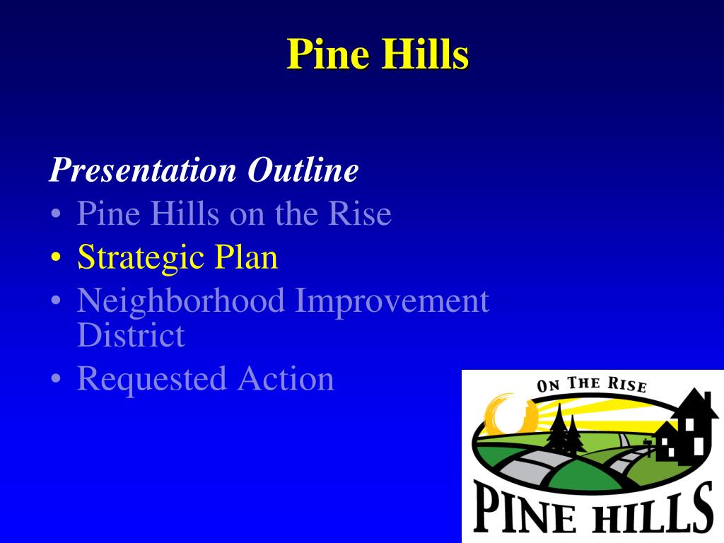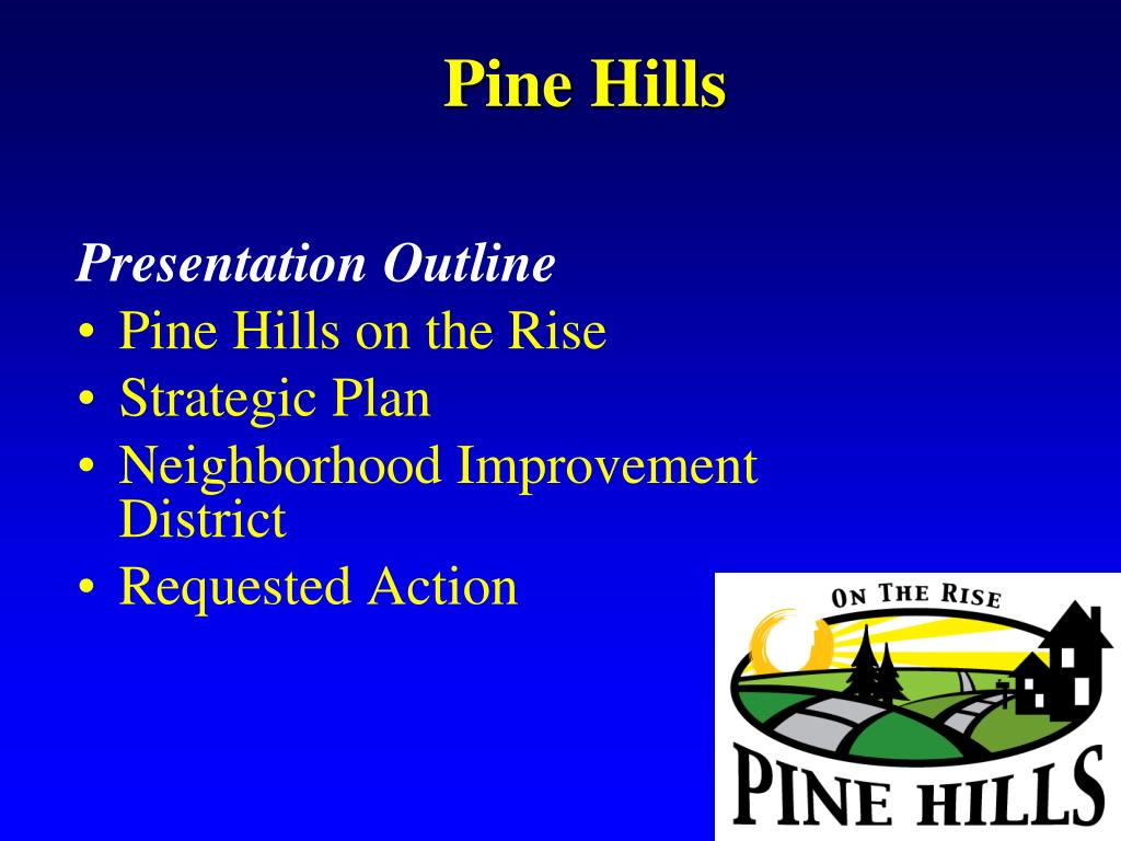 Pine Hills Presentation Outline • Pine Hills on the Rise • Strategic Plan • Neighborhood Improvement District • Requested Action