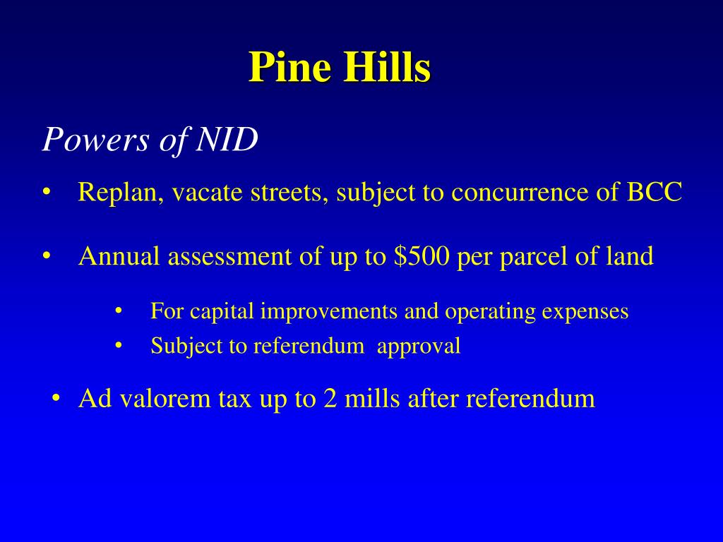 Pine Hills Powers of NID • Replan, vacate streets, subject to concurrence of BCC • Annual assessment of up to $500 per parcel of land • For capital improvements and operating expenses • Subject to referendum approval • Ad valorem tax up to 2 mills after referendum