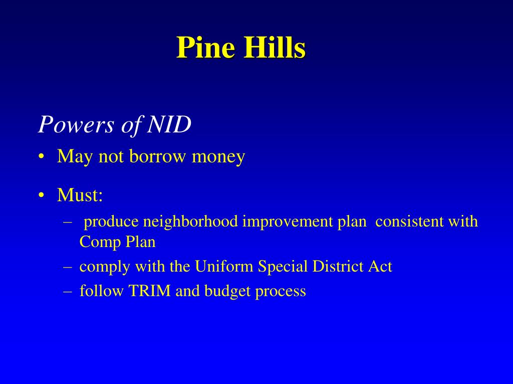 Pine Hills • Powers of NID • Accept grants, gifts, and donations • Enter into contracts; sue and be sued • Acquire, own, convey, lease, construct, manage property • Promote and advertise the NID • Improve streets, lighting, parks, streets, drainage, utilities and provide safe access to mass transit facilities