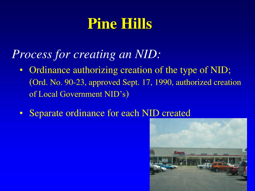 Pine Hills Process for creating an NID: • Ordinance authorizing creation of the type of NID; (Ord. No. 90-23, approved Sept. 17, 1990, authorized creation of Local Government NID’s) • Separate ordinance for each NID created