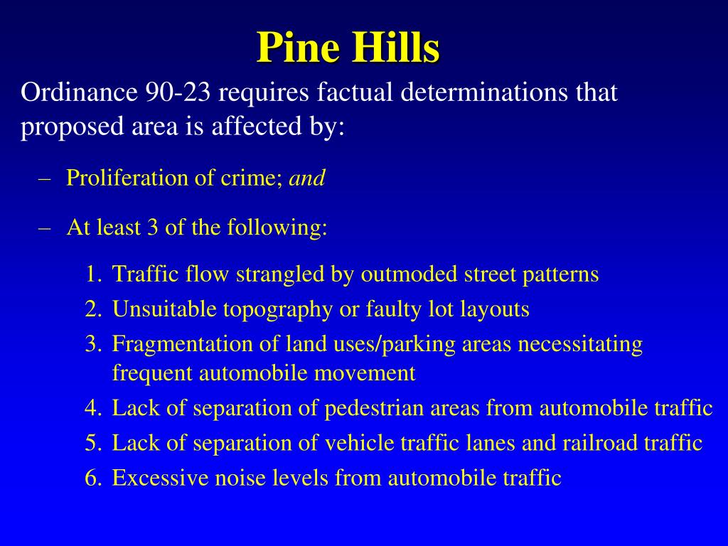 Pine Hills Ordinance 90-23 requires factual determinations that proposed area is affected by: • Proliferation of crime; and • At least 3 of the following: • Traffic flow strangled by outmoded street patterns • Unsuitable topography or faulty lot layouts • Fragmentation of land uses/parking areas necessitating frequent automobile movement • Lack of separation of pedestrian areas from automobile traffic • Lack of separation of vehicle traffic lanes and railroad traffic • Excessive noise levels from automobile traffic