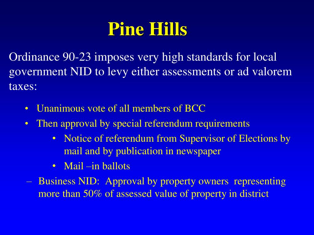Pine Hills Ordinance 90-23 imposes very high standards for local government NID to levy either assessments or ad valorem taxes: • Unanimous vote of all members of BCC • Then approval by special referendum requirements • Notice of referendum from Supervisor of Elections by mail and by publication in newspaper • Mail –in ballots • Business NID: Approval by property owners representing more than 50% of assessed value of property in district
