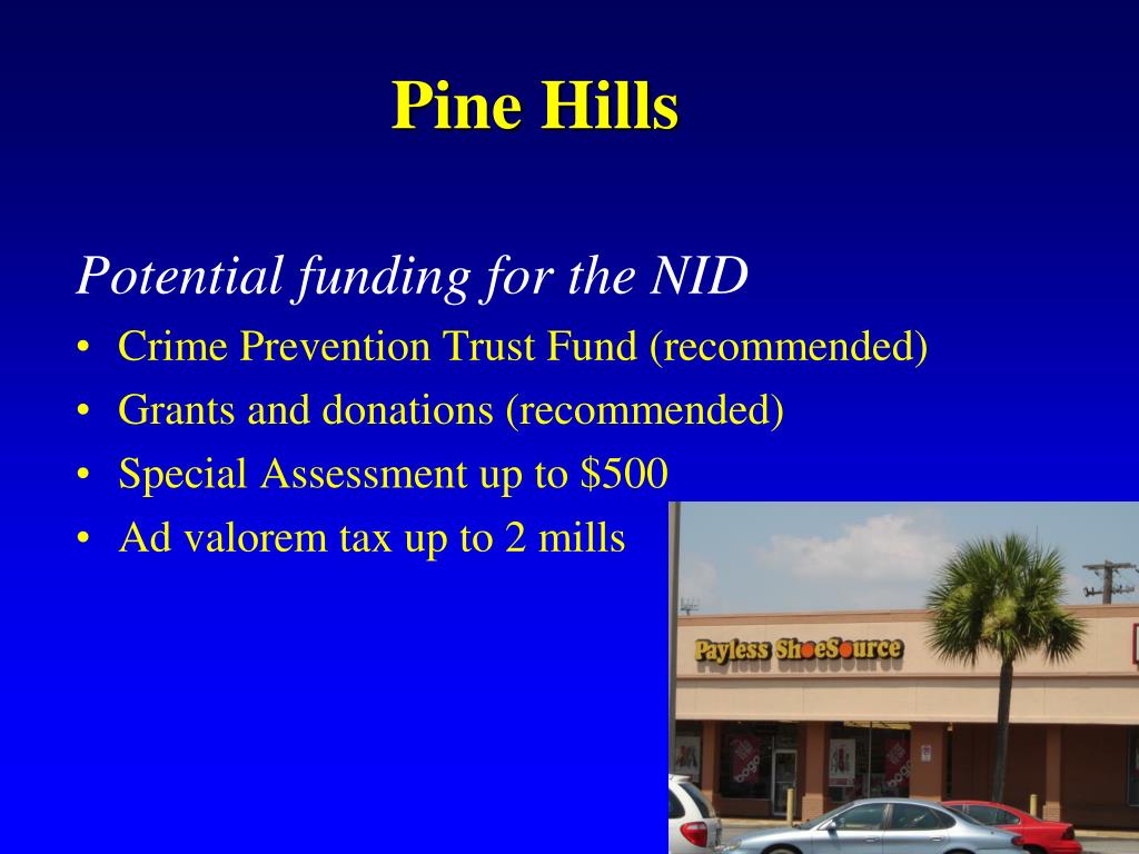 Pine Hills Potential funding for the NID • Crime Prevention Trust Fund (recommended) • Grants and donations (recommended) • Special Assessment up to $500 • Ad valorem tax up to 2 mills