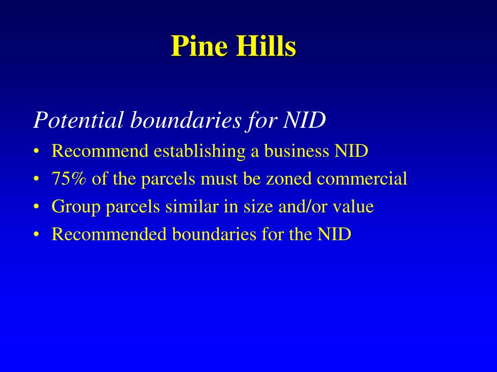 Pine Hills Potential boundaries for NID • Recommend establishing a business NID • 75% of the parcels must be zoned commercial • Group parcels similar in size and/or value • Recommended boundaries for the NID